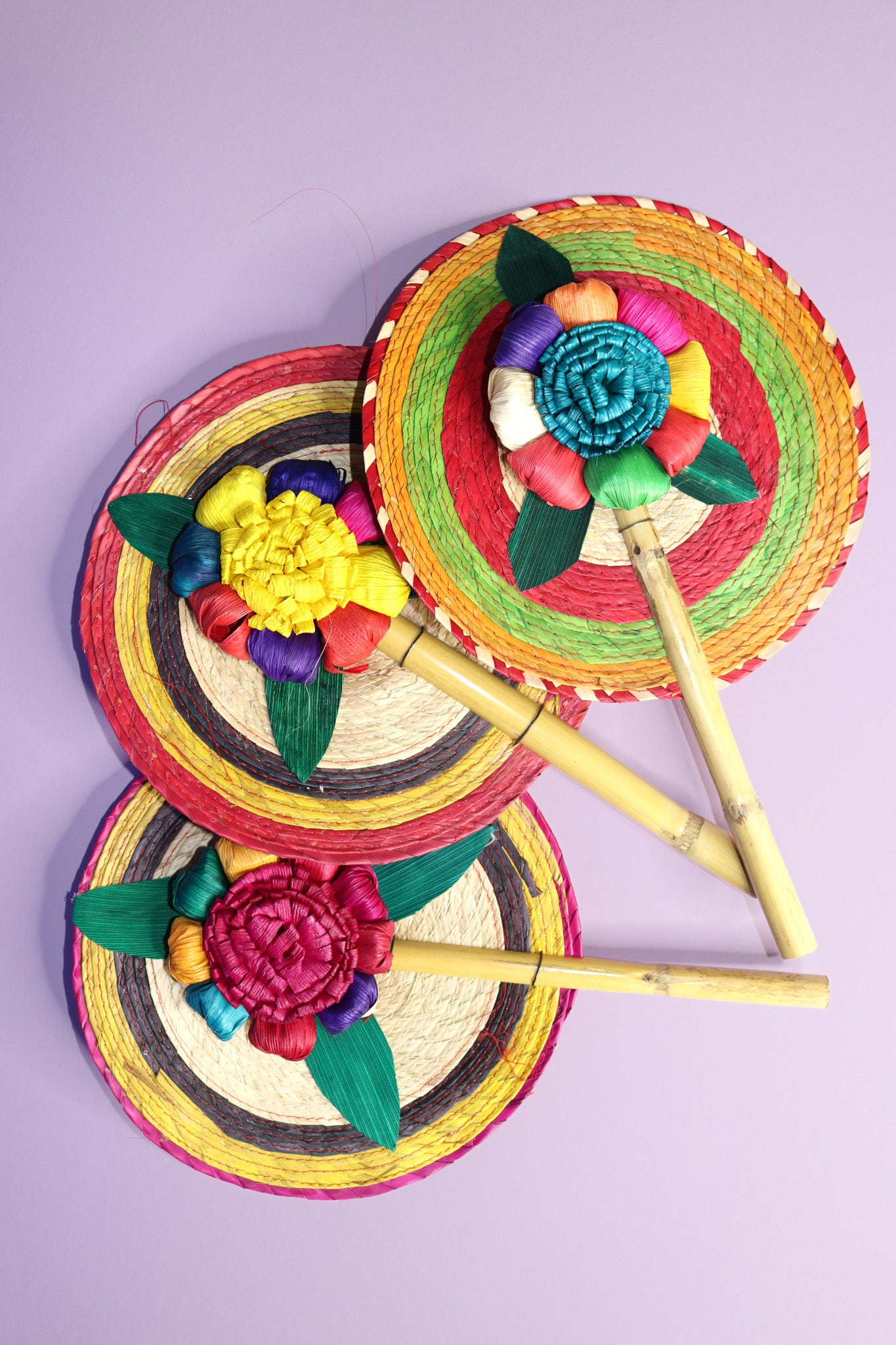 These hand fans are made by artisans with colorful palms. They are adorned with flowers and the handle is made from bamboo. Because of the handmade nature of these pieces, each one has a different color combination.